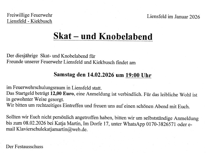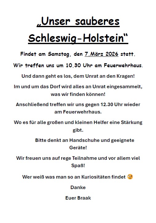 Aktuelles 07.03.2026 ab 10:30 Uhr Dorfputz 14.02.2026: Skat und Knobelabnd in Liensfeld 30.01.2026: Aktuelles von der Feuerwehr Liebe Braaker,Am Abend des 24.01.2026 fand die Jahreshauptversammlung unser den jeweiligen Unglücksort ankommen und auch mit den Folgen zurechtkommen müsst.Euer Motto Retten, Löschen, Bergen und Schützen ist für uns die Sicherheit dass ihr in den schlimmsten Stunden für uns da seid!Dafür und für vieles mehr möchten wir von Herzen Danke sagen. Wir wünschen euch ein hoffentlich ruhiges Jahr 2026. Euer Dorfvorstand